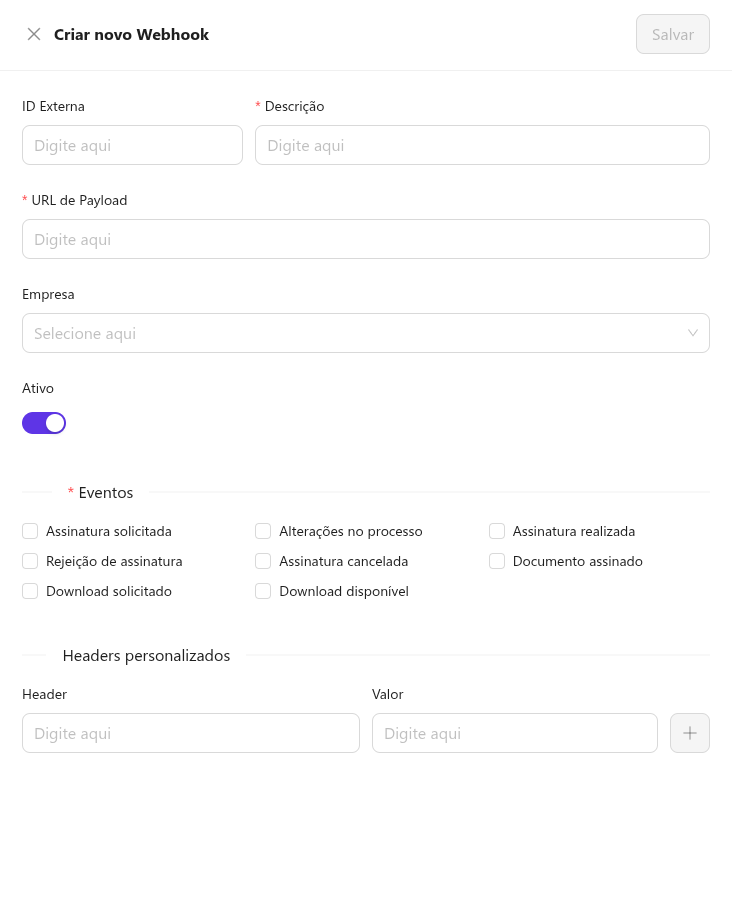 ID Externa: Identificador externo definido pelo usuário.Descrição: Descrição de texto sobre o Webhook.URL de Payload: Endereço para o qual os eventos do Webhook serão enviados.Empresa: Empresa à qual o Webhook estará vinculado e sobre a qual irá monitorar eventos.Ativo: Define se o Webhook está ativo ou não.Eventos: Selecione um ou mais eventos que o Webhook deverá monitorar:Assinatura solicitada: Acionado quando for realizada uma nova solicitação de assinatura de documentos.Alterações no processo: Acionado quando houver qualquer alteração de testemunhas ou modificação no endereço de email dos assinantes de um processo de assinatura.Assinatura realizada: Acionado quando algum assinante conclui a assinatura de um documento.Rejeição de assinatura: Acionado quando algum assinante recusa a assinatura de um documento.Assinatura cancelada: Acionado quando a assinatura de um documento é cancelada, incluindo o cancelamento total do processo de assinatura.Documento assinado: Acionado quando todos os assinantes concluem suas assinaturas e o documento já está disponível para visualização.Download solicitado: Acionado quando for solicitada a geração de download de um ou mais documentos.Download disponível: Acionado quando o download solicitado estiver disponível para acesso.