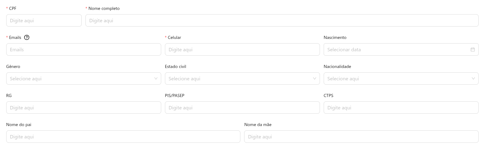 Campos marcados com um * são de preenchimento obrigatório. Demais campos podem permanecer sem preenchimento caso você não utilize essa informações em Modelos Dinâmicos.