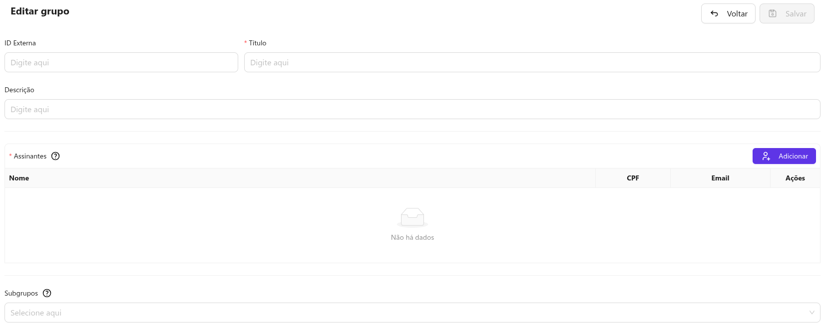 ID Externa: Identificador externo definido pelo usuário.Título: Nome utilizado para identificar o grupo.Descrição: Texto descritivo para facilitar a identificação do grupo.Assinantes: Lista de pessoas pertencentes ao grupo. Para adicionar novos assinantes, clique em Adicionar e siga os procedimentos indicados.Subgrupos: Grupos já existentes cujos assinantes serão automaticamente vinculados ao grupo atual. Alterações realizadas nos subgrupos serão refletidas diretamente no grupo principal.