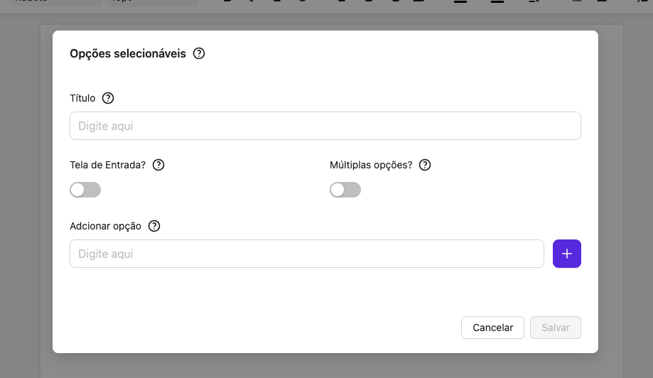 Título: descrição visível apenas para o assinante no momento da seleção das opções.Tela de Entrada: permite definir se esse selecionável deverá ser preenchido pelo usuário durante a solicitação de assinatura ou se deve ser preenchido pelo assinante durante a assinatura do documento.Múltiplas opções?: define se o assinante pode selecionar várias opções ou apenas uma.Adicionar opção: campo de texto para digitar o conteúdo das opções que o assinante poderá selecionar.